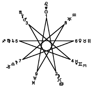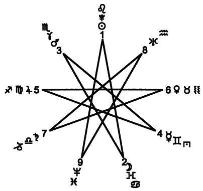 Семиконечная звезда. В семиконечной звезде повторяются характерные черты пятиконечной. Семь лучей имеет гностическая звезда. Семи– и девятиконечные звезды, начерченные одной линией, – мистические звезды в астрологии и магии. Звезда магов читается двояко: последовательно по ходу лучей (по линии начертания звезды) и по окружности. По ходу лучей расположены планеты, управляющие днями недели: Солнце – воскресенье, Луна – понедельник, Марс – вторник, Меркурий – среда, Юпитер – четверг, Венера – пятница, Сатурн – суббота. |