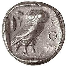 В древнегреческой мифологии сова являлась атрибутом богини мудрости Афины, носившей эпитет «совоокая». Изображения богини и ее крылатой спутницы чеканились на серебряных греческих монетах, именовавшихся в просторечии «совами»: профиль Афины — на аверсе, сова анфас — на реверсе. Символом мудрости и познания сова стала в силу того, что ее природное поведение напоминало эллинам образ жизни стремящихся к уединению философов, а способность совы видеть в темноте сделала ее символом проницательности.